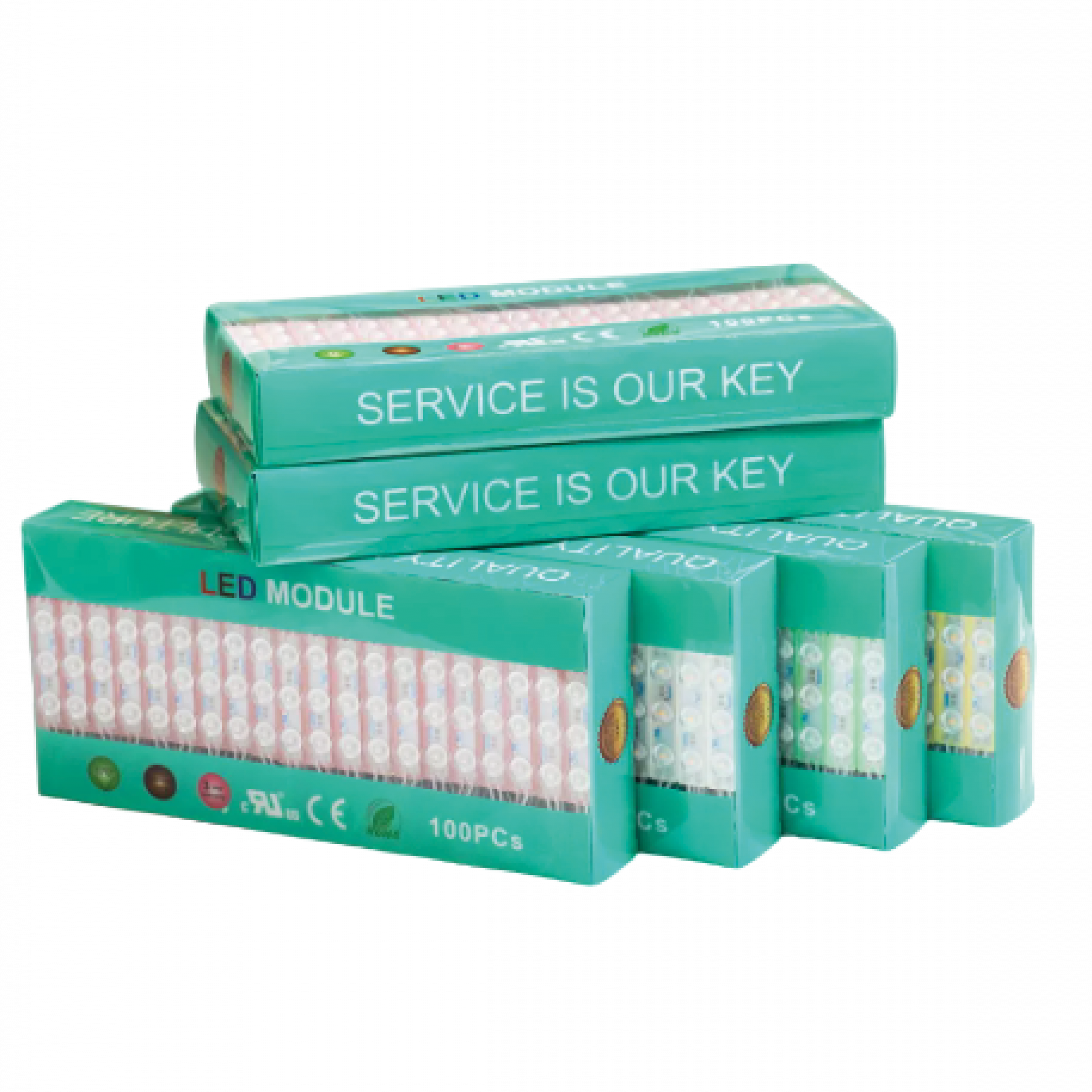Módulos LED Samsung multicolor de 3 diodos (12V DC). Perfectos para proyectos creativos o señalización. Colores vivos y control preciso. Incluye 100 unidades en bolsa resistente.