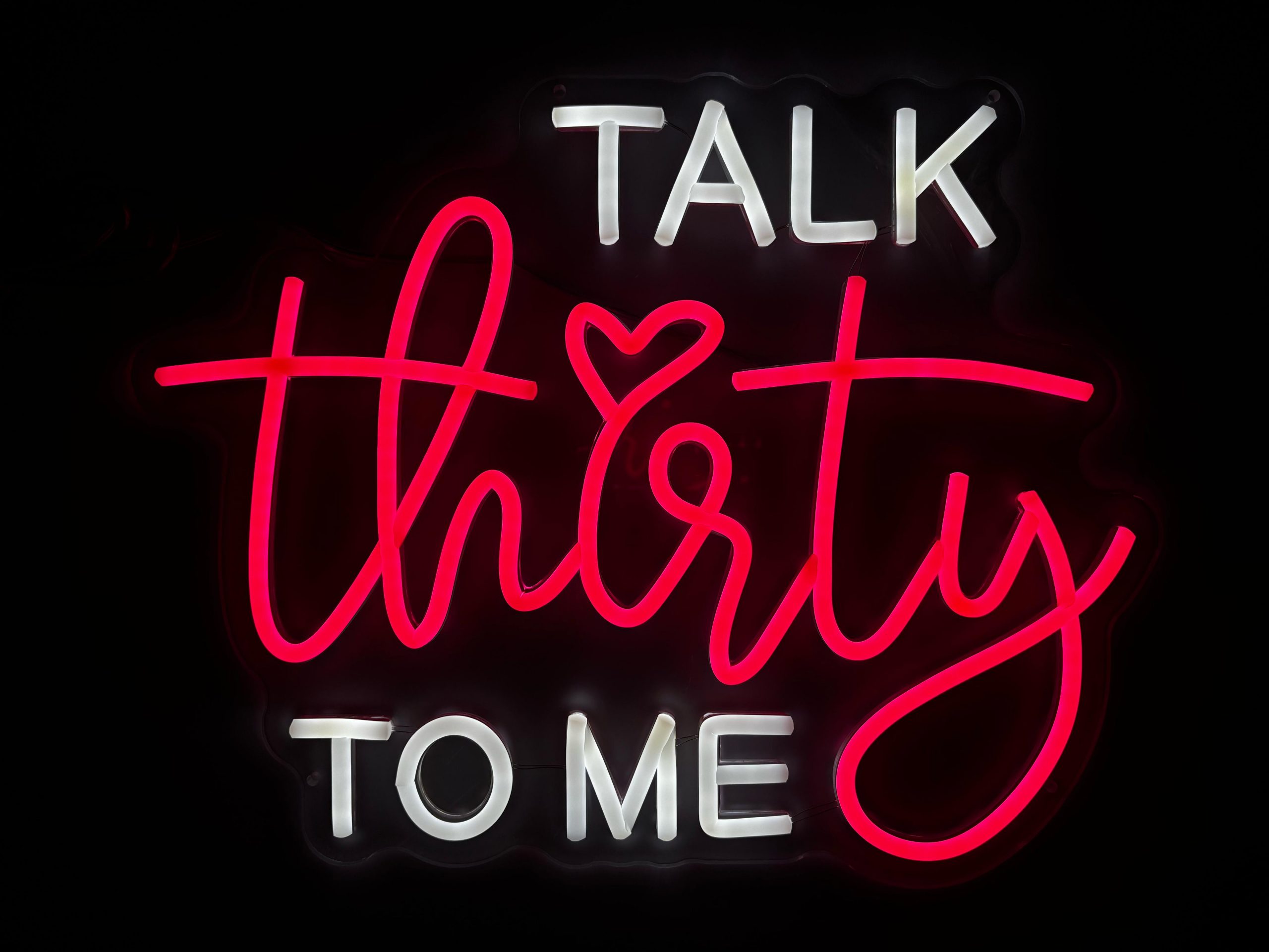 Letrero 'Talk Thirty To Me' en neón LED. Ideal para cumpleaños temáticos o decoración retro. Luz vibrante y segura.